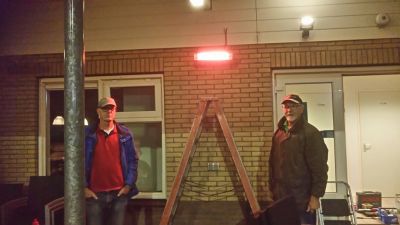 De terrasverwarming van Tennisvereniging Akkrum brandt. Anne Hof (l) en Fred Zondervan hebben de beide branders opgehangen. Tijdens de tweede wedstrijdavond van de interne woensdagavondcompetitie wordt het jubileumcadeau uitvoerig getest.