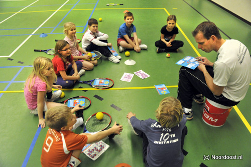 Akkrum, 23 december 2011 - Trainer Wilfred geeft jeugdleden van Tennisvereniging Akkrum les in de sporthal.