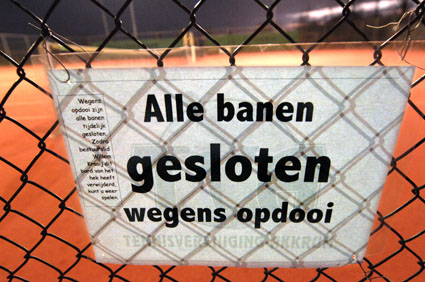 | Nachtje vorst gooit roet in eten Banen toch weer dicht De vorst van donderdagnacht gooit roet in het eten van de winterse tennisliefhebbers. Na overleg met Ingenieursbureau Oranjewoud, dat de banen aanlegde, heeft baancommissaris Willem Kraaij besloten de tennisbanen tot zeker na het weekend te sluiten. Woensdag 14 januari en donderdag 15 januari kon er wel worden gespeeld. Het speelverbod is aangekondigd door middel van plakkaten aan de ramen en in de hal van ons clubgebouw en ook met een bord aan het hek van baan 1. Het speelverbod geldt voor alle banen.