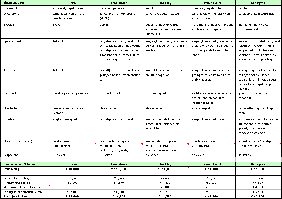 De commissie geeft een advies over speeleigenschappen van baansoorten en niet over te nemen beslissingen op financieel terrein. Voor een indicatie voor bestuur en leden heeft de commissie zich wel georiënteerd over de kosten die gemoeid zijn bij renovatie naar een nieuwe baansoort. Deze worden gegeven voor de baansoorten Gravel, EasiClay, FrenchCourt, Kunstgras LSR en Tennisforce.